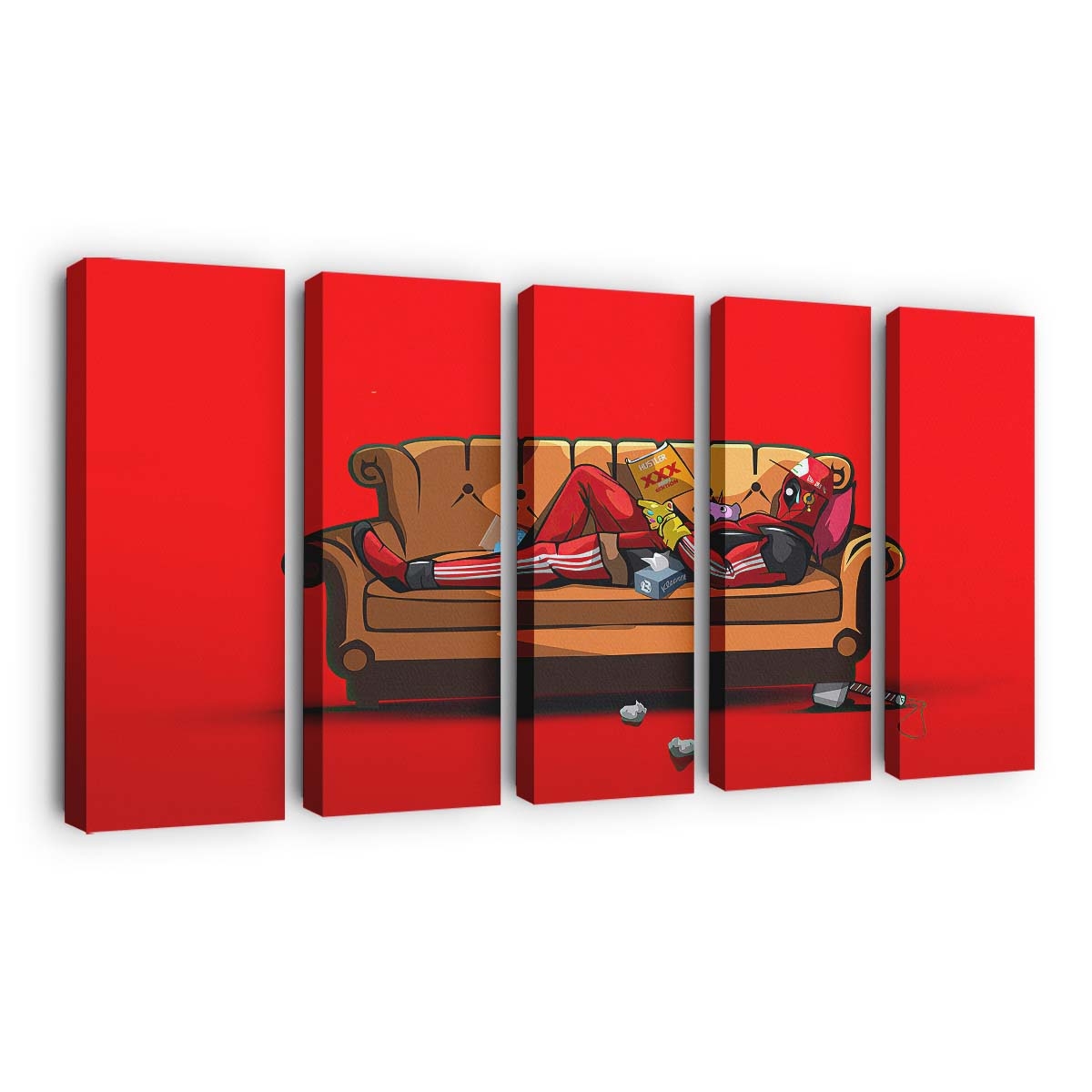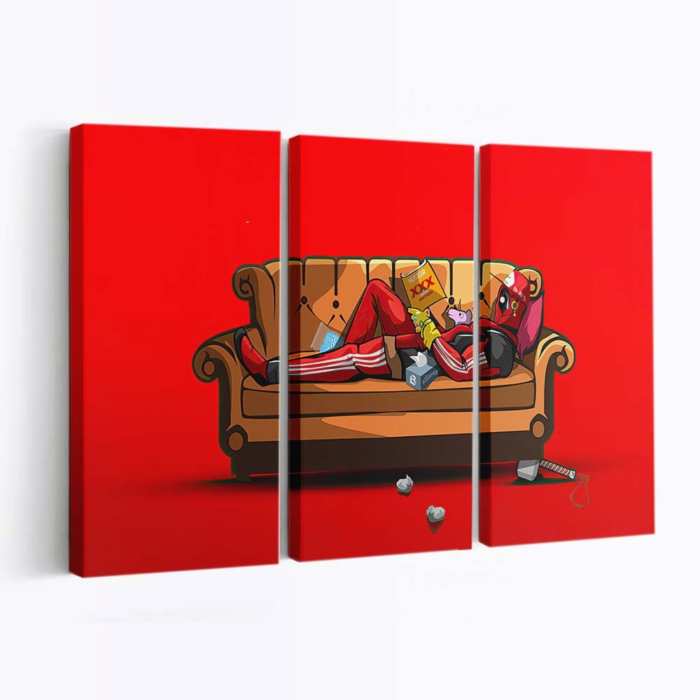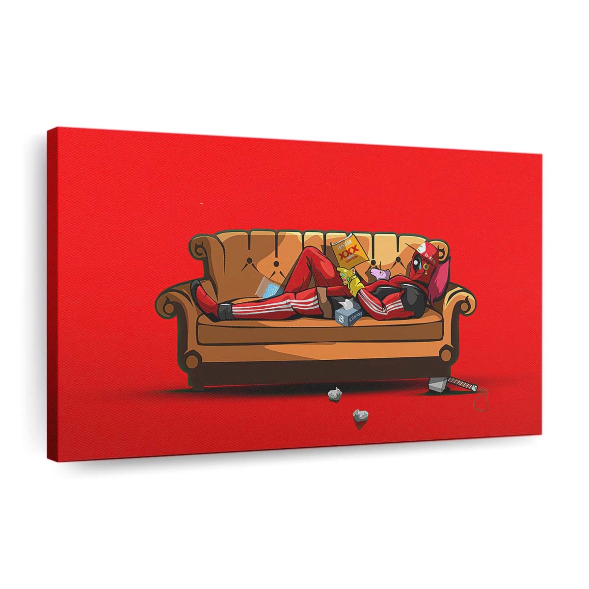 - Charakterstarkes Design: Ein unverwechselbares Artwork von Deadpool: Chillen Leinwandbild – Marvel Wanddeko, das seinen Humor und seine Wildheit perfekt einfängt.