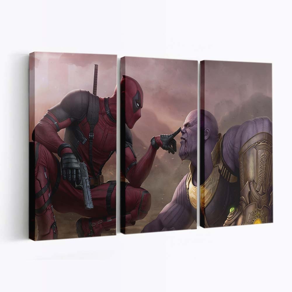 - Charakterstarkes Design: Ein unverwechselbares Artwork von Deadpool vs. Thanos Leinwandbild – Marvel Wanddeko, das seinen Humor und seine Wildheit perfekt einfängt.