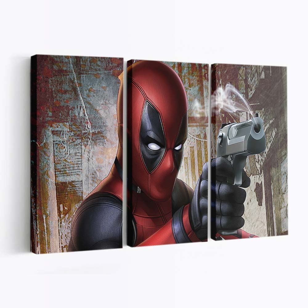 - Charakterstarkes Design: Ein unverwechselbares Artwork von Deadpool Waffen-Artwork 2 Leinwandbild – Marvel Wanddeko, das seinen Humor und seine Wildheit perfekt einfängt.